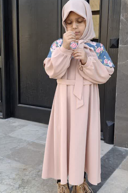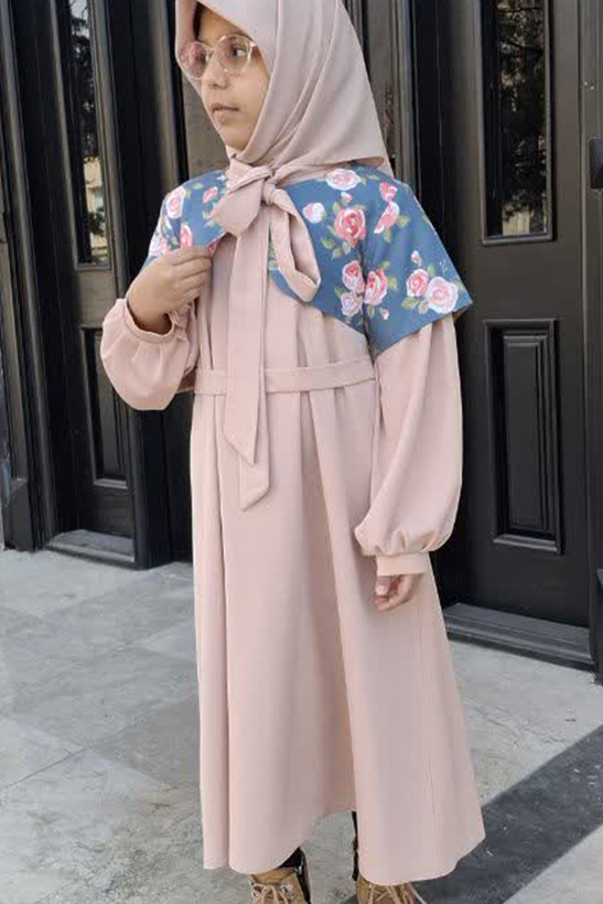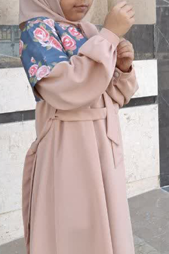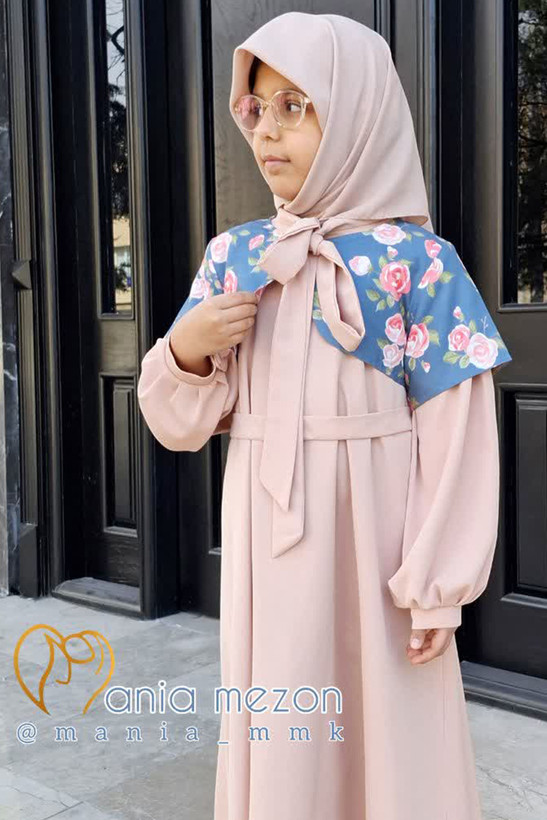 عبای نوجوان آلا جنس عبا ،کرپ الیزه یقه کرواتی دارای کمربند از جنس و رنگ عبا جنس کت میکرو با نقش زیبای گلهای رز بزرگ